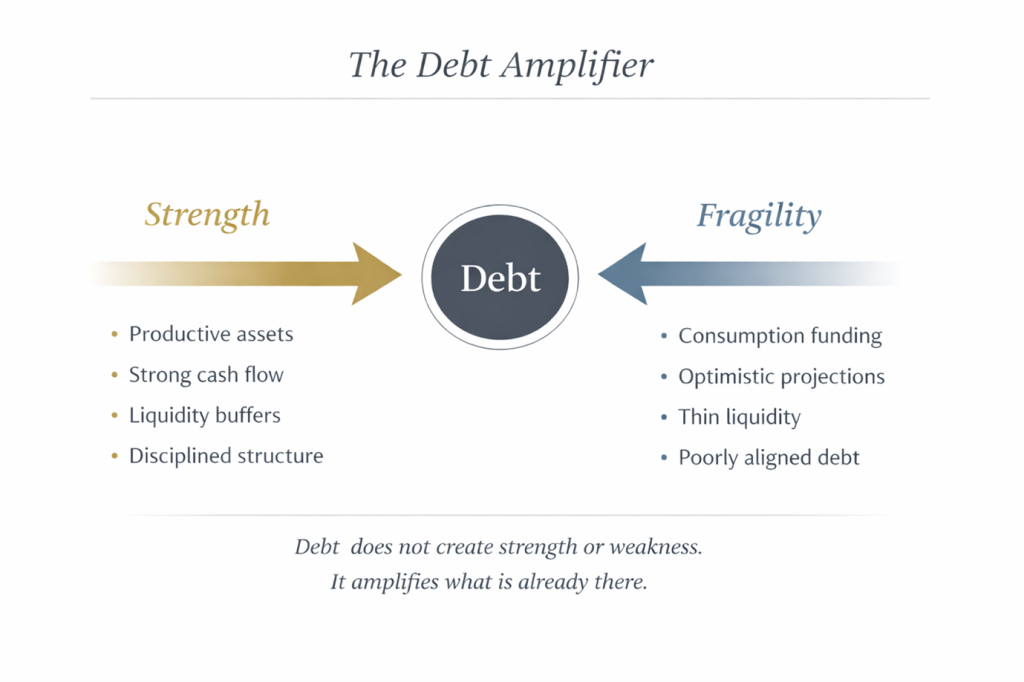This is where debt reveals its true nature. The reason is that debt behaves very differently depending on the structure beneath it. The same leverage that builds wealth in one environment can destroy it in another. The same facility that funds growth, can become the pressure point that collapses a balance sheet.
